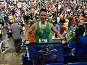 This year the event started & ended in the Fargodome, plus you can actually pick up a GPS signal inside for your watches. The noise was booming inside from the supporters & runners. It was helpful to keep out of the early morning cold, place your bags, normal toilets & pick up many free goodies. Under Armour were the event organisers whom provided quite useful reusable bag. Plus you get your free tee-shirt before the event. The race course changes each year; normally a loop course, the area is very flat & is a must do racecourse qualify if you want to participate in the Boston marathon for Americans. Friday is the 5k, Saturday is the full marathon, half marathon & 10k. Various start times & varied routes well marked. You can practically join in anywhere you think at the start with the pacers. Unfortunately we were just a little late & joined right at the back when the gun went off. Generally you run past the many beautiful wooden styled homes, local businesses like cafes, old cinema, railway stations, colleges & University etc. Many American flags were waving, followed by the North Dakota flags & at times the Norwegian flags. Practically every street has supporters from the area; many children wanting to high five, live bands from rock to old Norweigan folk music, plenty of water & power aid drinks stops.