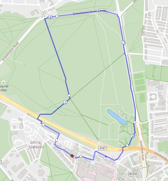 A straightforward route onto the Moor, looping around Grandstand Road and the Great North Road.